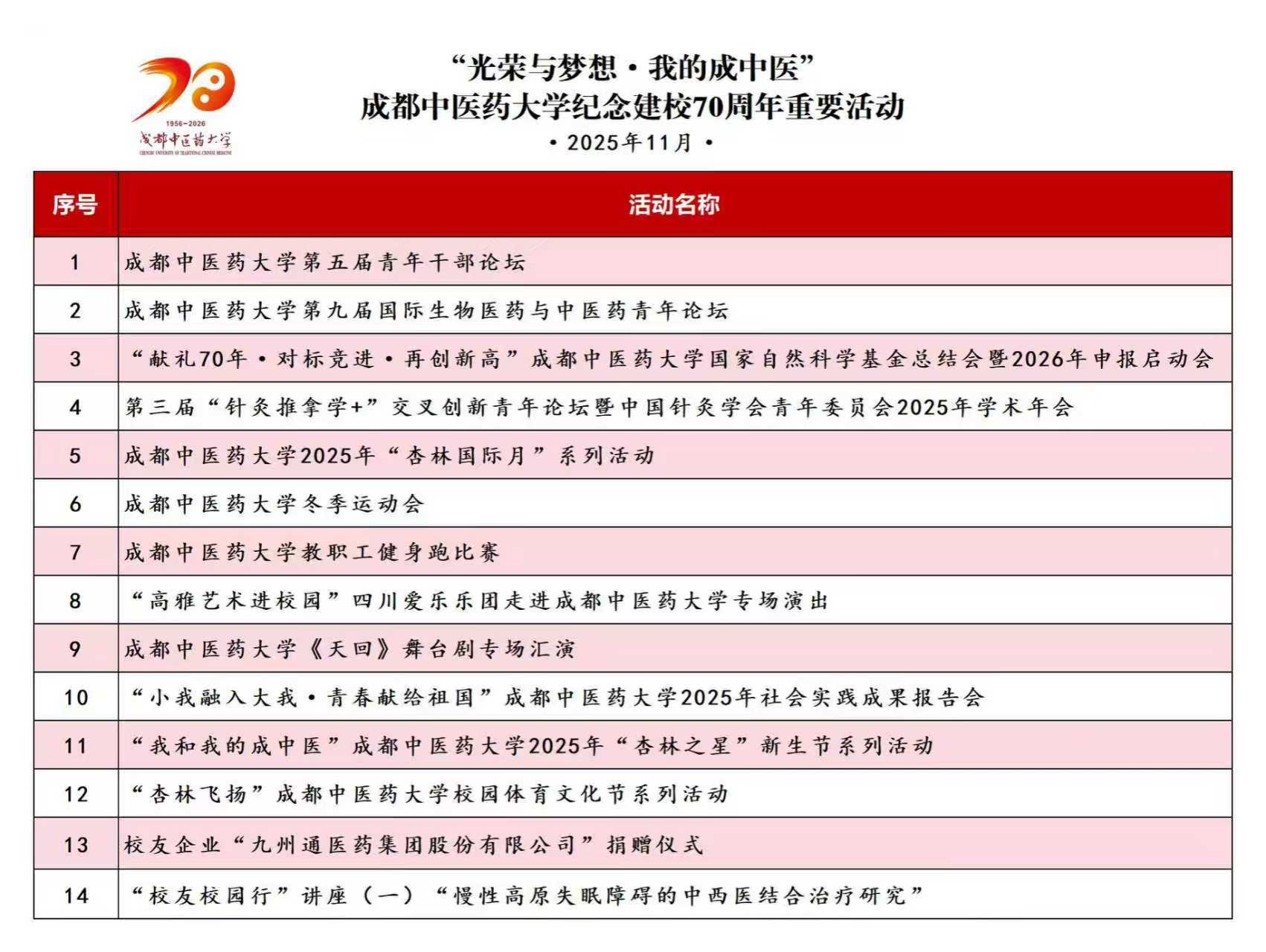 【校庆专题】纪念建校70周年重要活动(11月) 发布时间:2025-11-03 19:08:55 浏览次数: 次 【字体:小 大】 【打印正文】 上一条:“光荣与梦想”|高雅艺术进校园——四川爱乐乐团走进成都中医药大学专场演出成功举行 下一条:我校成功承办2025年四川省教育系统内部审计培训班
