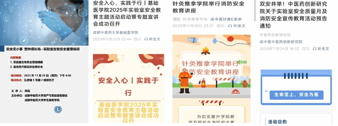 各学院、中心积极响应学校的实验室安全建设质量月部署,结合自身学科特点与实验室风险特性,组织开展了一系列形式多样、富有特色的主题活动。校内外安全专家与经验丰富的实验教师应邀进行授课,通过政策解读、标准剖析、实操演示相结合的方式,将抽象的制度条文转化为具体的工作指南,显著提升了师生,特别是新入职教师和研究生的安全风险辨识与防范能力。养生康复学院聚焦生物安全,组织学习了血液及代替品的生物安全;基础医学院、针灸推拿学院、中医药创新研究院等强调了在临床教学科研中实验室的用电与消防安全。这些贴近学科实际的活动,极大地激发了各学院、中心的安全管理能动性,使得安全要求真正落地到每一个实验环节和每一位操作者。