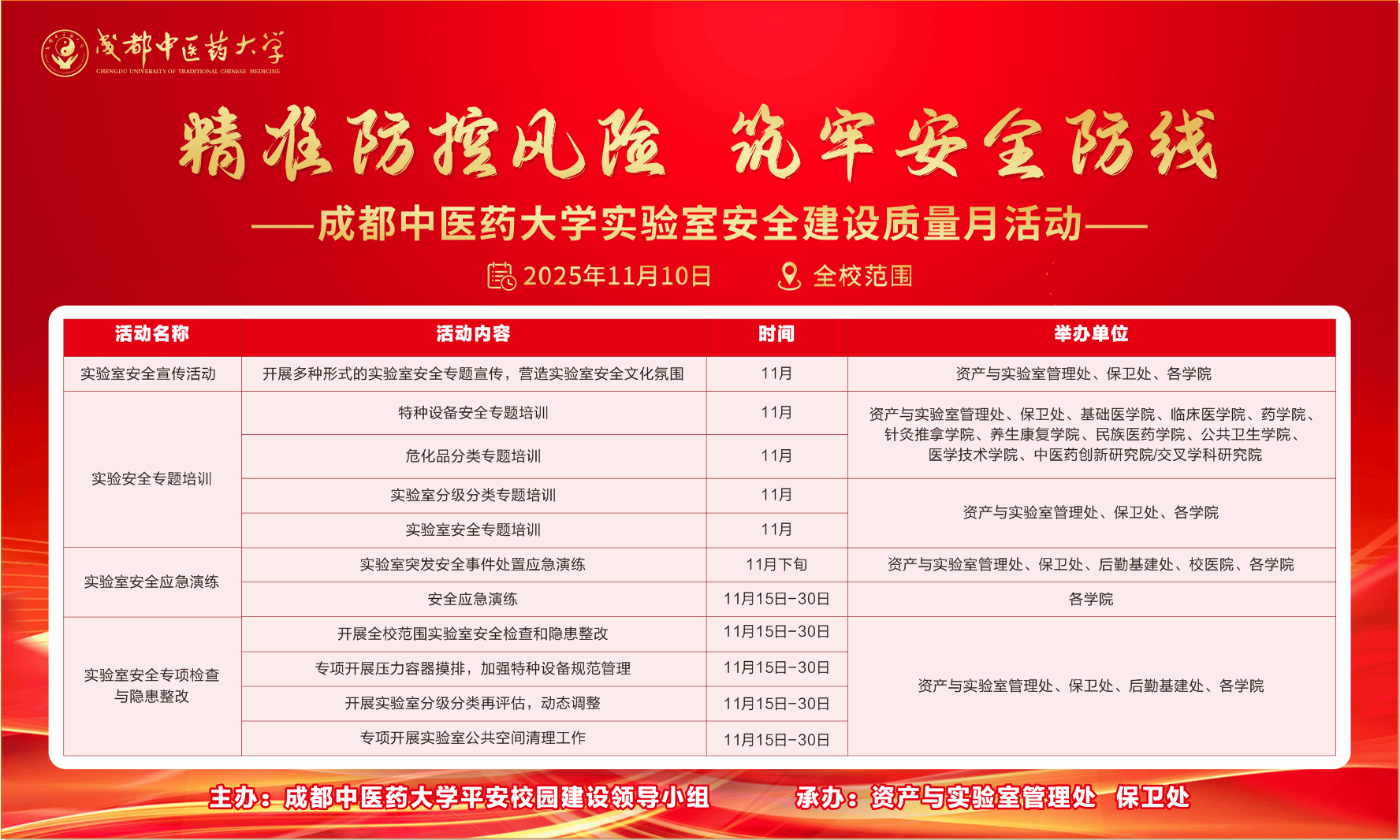 本次实验室安全建设质量月活动,是学校构建长效机制、深化安全文化建设的关键一环。它不仅是一场集中性的安全教育盛宴,更是一次全员安全责任的再压实、安全能力的再提升、安全防线的再加固。学校将持续以“时时放心不下”的责任感,将安全管理工作常态化、精细化,确保安全理念内化于心、外化于行,全力守护广大师生生命安全与校园稳定,为我校新一轮“双一流”建设征程保驾护航。