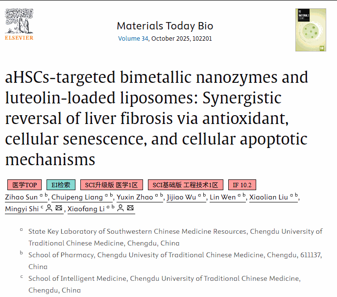 2025年8月,我校现代中药产业学院李小芳教授团队和智能医学学院施明毅副教授团队,在《Materials Today Bio》(中科院一区,TOP期刊)上发表题为“aHSCs-targeted bimetallic nanozymes and luteolin-loaded liposomes: Synergistic reversal of liver fibrosis via antioxidant, cellular senescence, and cellular apoptotic mechanisms”的研究论文。2023级硕士研究生孙梓昊为第一作者,成都中医药大学李小芳教授与施明毅副教授为共同通讯作者,成都中医药大学为论文第一完成单位(图1)。