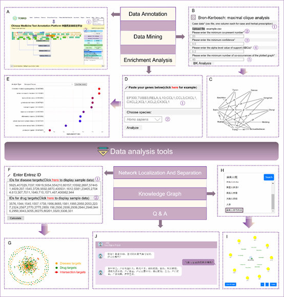 TCMKD平台进一步集成了多种高效的数据分析工具(图3 TCMKD平台工具展示),旨在系统挖掘中医药大数据中蕴含的内在规律与作用机制。平台的核心功能包括:基于 Apriori 算法 的数据挖掘模块,用于识别高频药材组合;以及基于 Bron-Kerbosch 算法 的关联分析模块,用于揭示方剂中关键药对之间的潜在联系。此外,平台还提供 聚类分析 与 决策树分析 工具,可通过定量评估药材与疾病间的关联强度,实现对潜在治疗靶点的分类与预测。