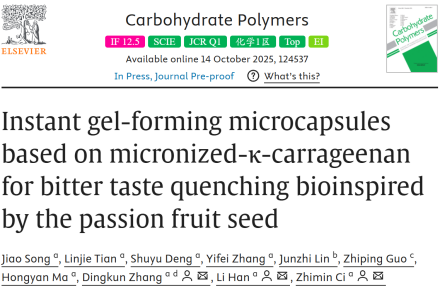 2025年10月,我校学者在《Carbohydrate Polymers》(中科院一区,TOP期刊)上发表题为“Instant gel-forming microcapsules based on micronized-κ-carrageenan for bitter taste quenching bioinspired by the passion fruit seed”的研究论文。药学院2022级博士研究生宋娇为第一作者,张定堃教授、韩丽教授、慈志敏老师为共同通讯作者,成都中医药大学为论文第一完成单位(图1)。