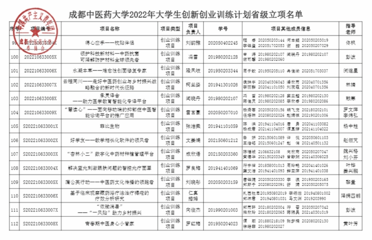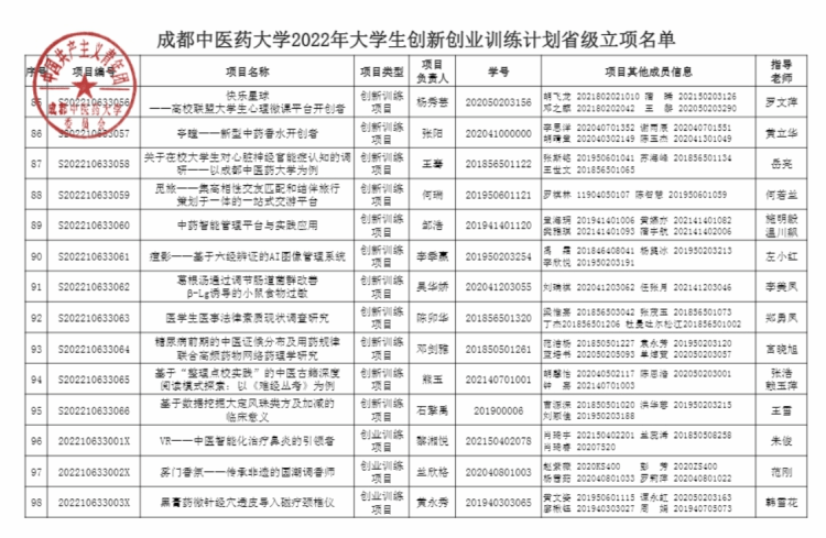 根据成都中医药大学 2022 年大学生创新创业训练计划立项工作的通知要求,校团委积极开展了2022年大学生创新创业训练计划立项工作,现已完成立项名单公示,我院共有3个项目入选。