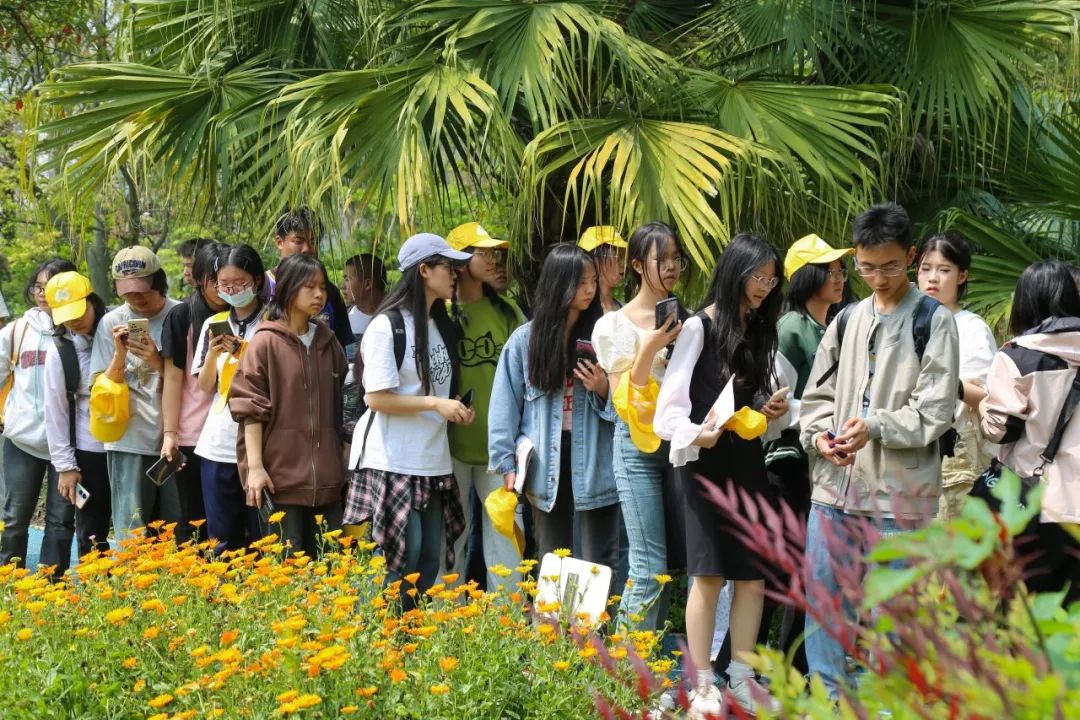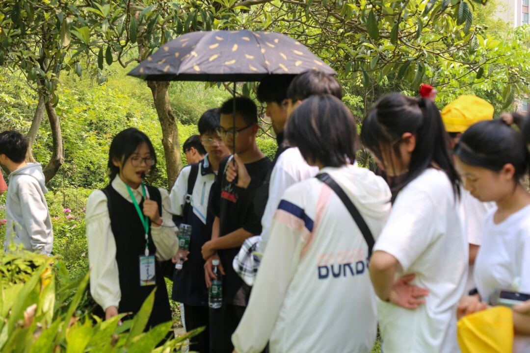 结束讲座,汉源二中同学们沿一环路逆时针前行,路过空中足球场,不知不觉就到达了药用植物园。植物园占地80亩,栽培200余科,1000余种药用植物。在讲解员的带领下,同学们见到各种各样的中药材,如黄连,射干等,和讲解员积极提问,学习基础植物属性分类知识。