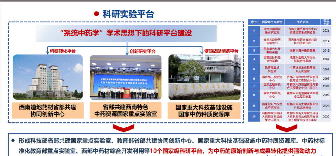 学院有多个国家级、省部级科教融合、产教融合育人平台,包括教育部全国高校实践育人创新创业基地、科技部创新人才培养示范基地、西南特色中药资源国家重点实验室、省部共建协同创新中心、国家级实验教学示范中心、国家中药种质资源库、教育部工程研究中心,省部级重点实验室8个,财政部基础实验室3个,国家中医药管理局重点研究室1个,国家中医药管理局科研实验室5个,非物质文化遗产保护传承基地1个。此外围绕中药与校外共建实习基地40余个。