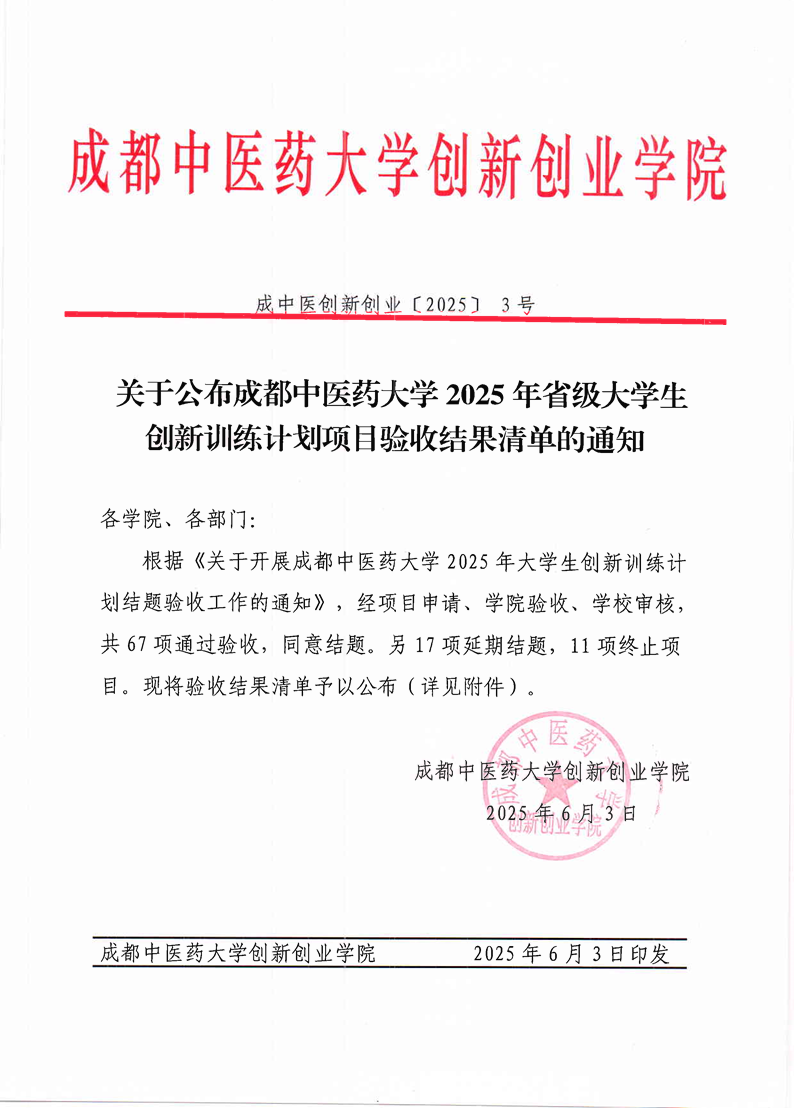 关于公布成都中医药大学2025年省级大学生创新训练计划项目验收结果清单的通知 来源: 发布时间:2025-06-13 16:54:22 浏览次数: 次 【字体:小 大】 终审:创新创业管理员 【打印正文】