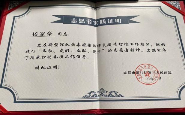 2017级中西医1班杨家豪 于2020年2月5日至2月19 日参加了温江区第三人民医院的防疫工作:在医院帮助筛查体温。