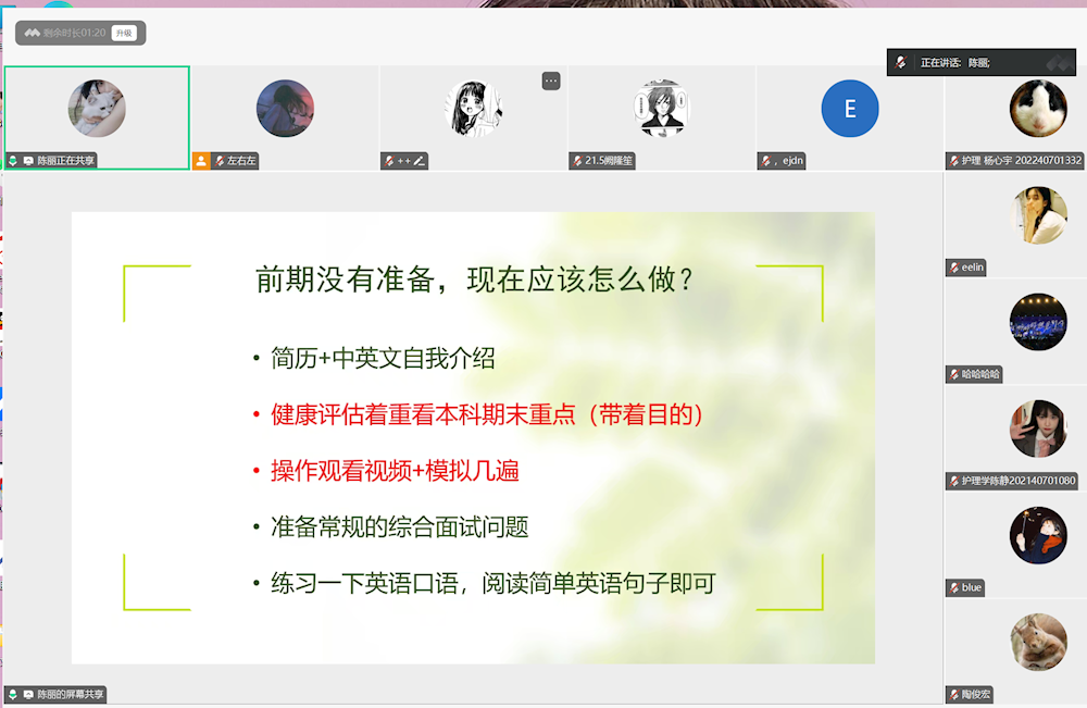 曹庭同学着重介绍了护理学科硕复试和专硕复试的区别,向同学们剖析了专业课程笔试的情况,讲解了如何在平时的实习工作中提升技能操作和专业水平,建议同学们通过阅读学术论文、关注行业动态等增强专业素养。同时他还强调了复试面试表达能力和自信的重要性,鼓励同学们要善于和勇于表达。