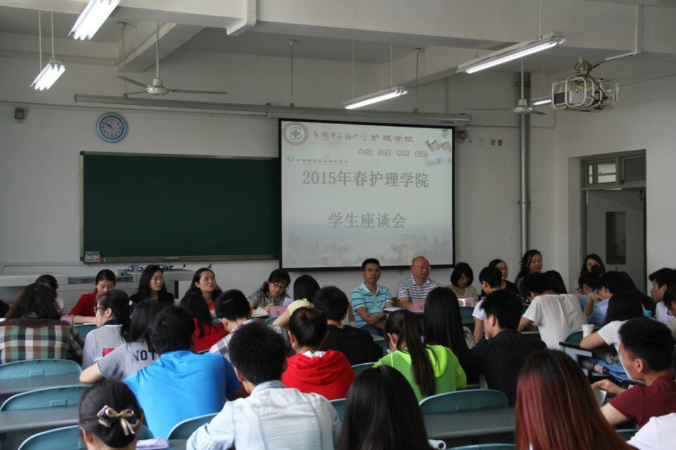 4月17日上午,护理学院在D-503举行2015年春季学期学生座谈会。学院党委书记刘世云,副书记孔静,副院长侯朝铭、高静,学院各科室科长,全体辅导员及70余名学生代表参加座谈会。孔静主持会议。