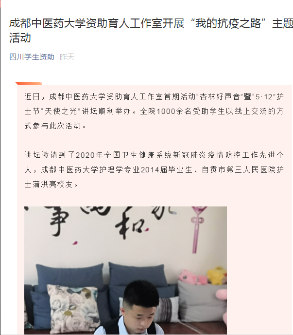 近日,成都中医药大学资助育人工作室首期活动“杏林好声音”暨“5·12”护士节“天使之光”讲坛顺利举办。1000余名受助学生以线上交流的方式参与此次活动。