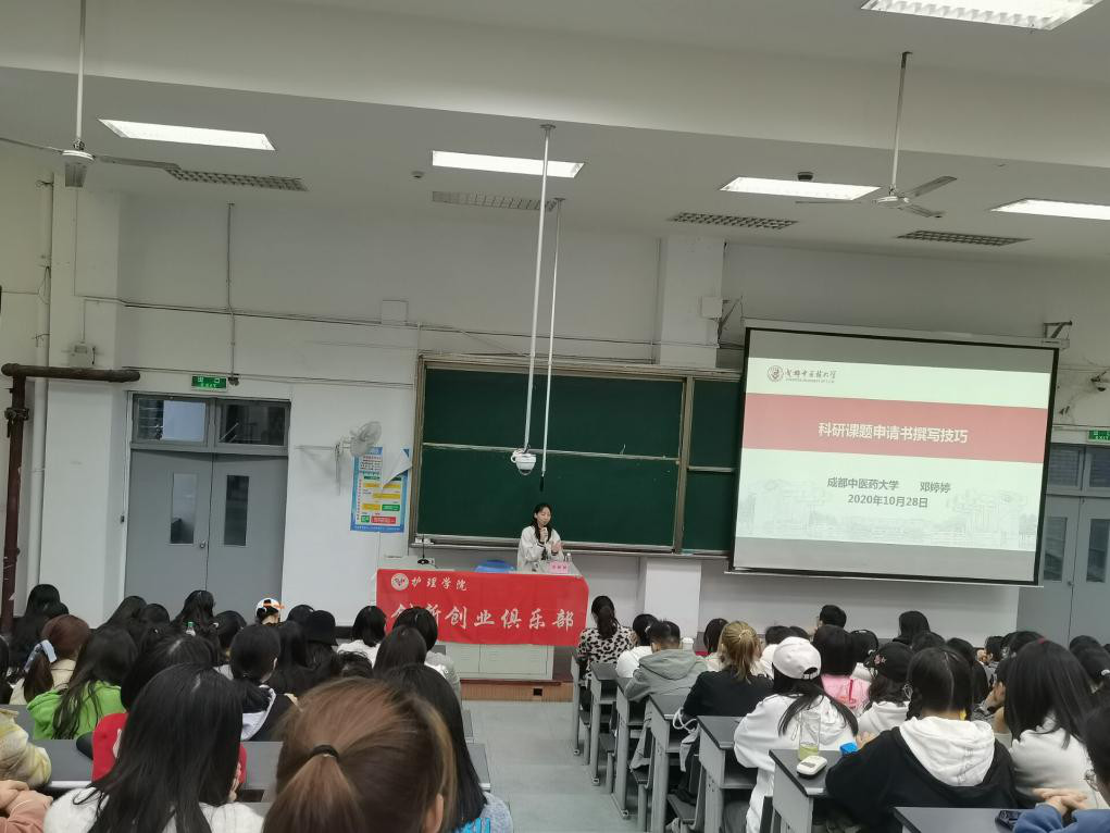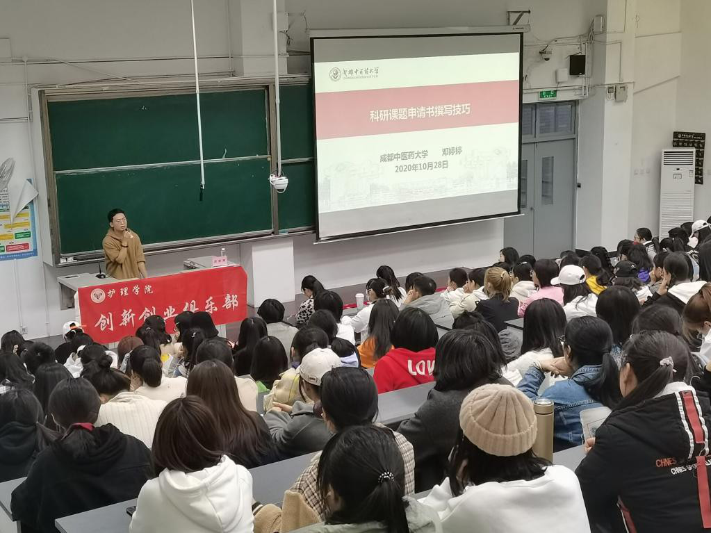 2020年10月28日晚18时,由成都中医药大学护理学院创新创业俱乐部举办的“科研课题申请书撰写技巧”讲座在A教314成功举办。参加此次讲座的嘉宾包括护理学院基础护理教研室邓婷婷副教授、护理学2018级2班同学罗靖松和陶妍敏、护理学院辅导员宋敏灵、护理学院创新创业培训班全体成员以及2020级学生代表共计200余人。