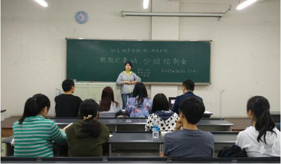 2015年3月31日晚,针灸推拿学院/第三附属医院于A教401开展校报记者分站建立暨招新会。院分团委学生会副主席廖唯惟、院分团委宣传信息部部长甘雨、副部长王伟策、副部长孙中文担任此次招新会面试员。