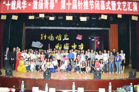 2014年5月26日晚18:00,由针灸推拿学院/第三附属医院主办,院分团委学生会承办的“针情时光·邮寄十年”第十届针推节闭幕式暨文艺汇演在百会堂演播大厅完美落下帷幕,第十届针推节的所有活动也圆满结束。校党委常委、副厅级调研员徐廉、校党委宣传部副部长罗晓文、学生处处长叶军、学生处副处长/校团委书记佟枫、院党委书记/副院长金荣疆、院党委副书记杜娟、副院长张俭、学生科副科长李欣华、分团委书记冯丽娟以及辅导员们出席了本场晚会。