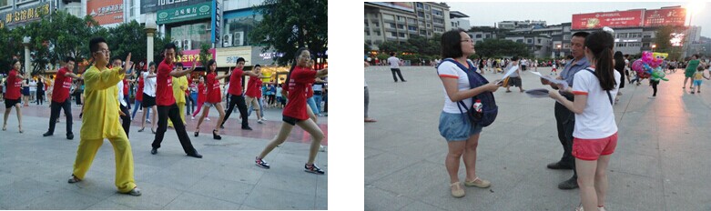 7月12日,实践队在到达巴中后,经过短暂的休整便投入到实践活动最后的准备工作当中,队员分工协作,工作进行地有条不紊。晚上七点,实践队携手赞助商云风日产在巴人广场进行太极表演,队员们向市民分发宣传单并详细讲解实践活动内容,为之后的活动宣传造势。
