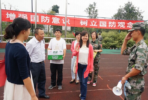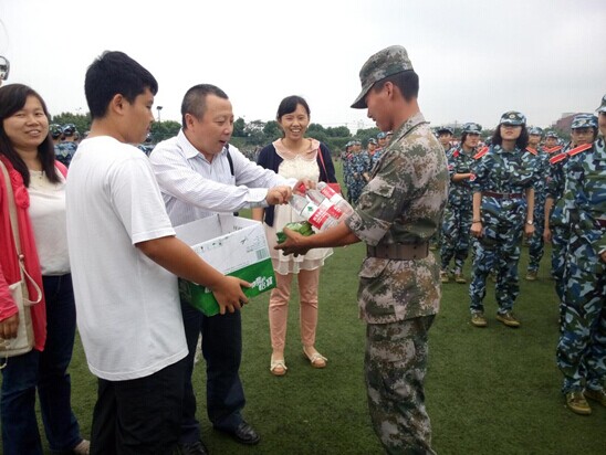 新生军训进行得如火如荼,学院领导也来到军训操场上,慰问军训教官及学生。领导们向教官们了解了学院新生的训练情况,感谢其细心教导,并对教官们进行慰问感谢——代表学院向教官赠送了矿泉水水与润喉含片,希望他们在教导之余,也能照顾好自己。