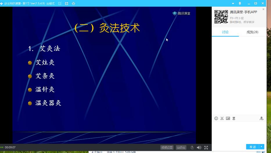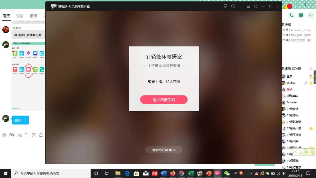 2月15日晚20:30针灸临床教研室的老师们准时集合在QQ群,开始了忙碌的“直播”演练。老师们是主播,也是观众。大家对即将使用的网络平台“腾讯课堂”与“QQ直播”进行了上课预演。学院副院长赵凌研究员首先就《刺法灸法学》尝试了“腾讯课堂”进行PPT演示,共邀请了31位研究生同学与老师们一起进入网络课堂。此后,切换至掌上金课,测试与展示了如何进行线上互动。