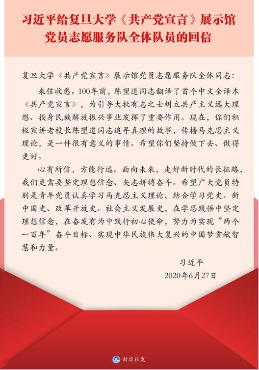6月27日,中共中央总书记、国家主席习近平给复旦大学《共产党宣言》展示馆党员志愿服务队全体队员回信,勉励他们讲好关于理想信念的故事,继续传播马克思主义理论,并对全国广大党员尤其是青年党员提出了殷切希望。认真学习回信精神,对引导广大青年,特别是共产党员坚定理想信念、在奋发有为中走好新时代的道路有重要意义。